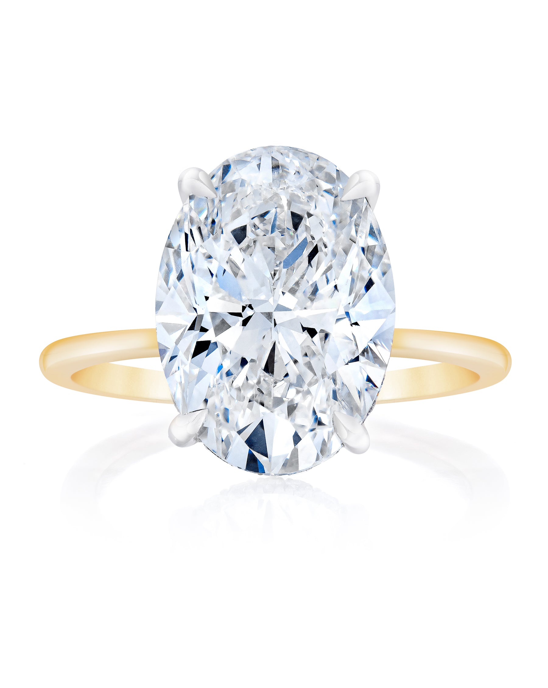 The oval diamond gives off a beautiful sparkle appearance filled with fire and brilliance. One of the more elongated shapes, the oval is most popular set in our Whisper Thin as it often looks bigger than its size and makes the finger look longer.